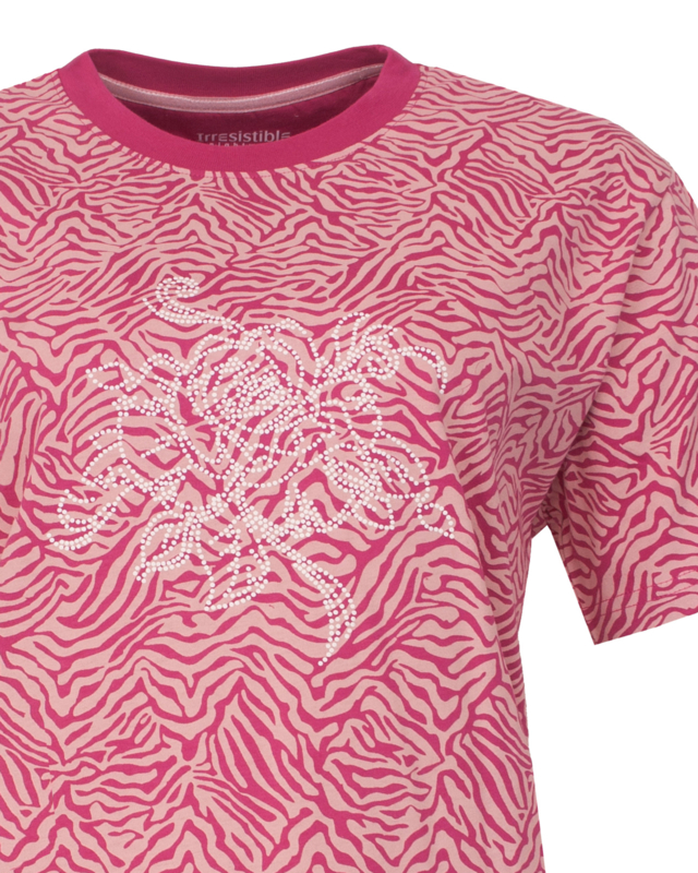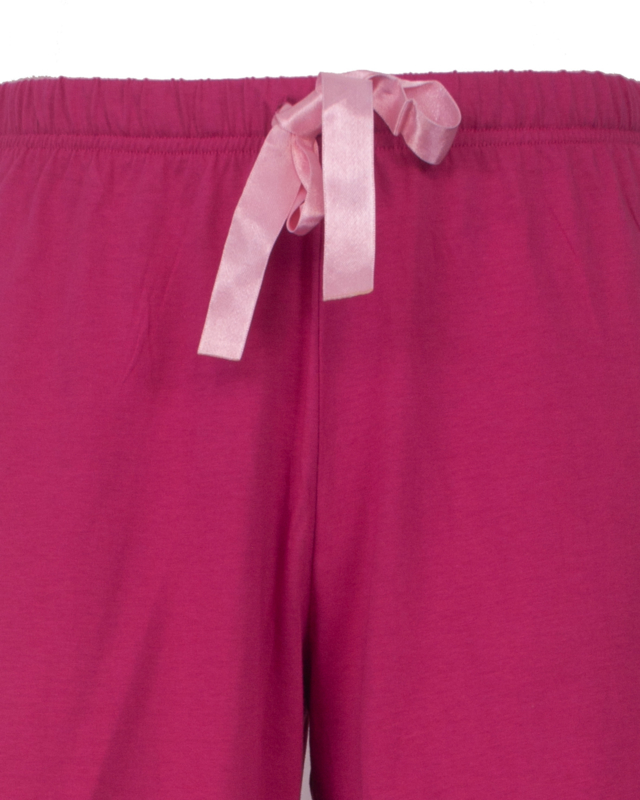 Mooie Irresistible dames shortama fuchsia. Deze shortama is vervaardigd uit 100% gekamd katoen in een comfortabele en rekbare jersey stof. De all-over geprinte top is voorzien van een ronde hals. Op de borst bevindt zich een zachte eenkleurige puffprint in de vorm van een roos. De effen korte fuchsia broek beschikt over elastiek in de taille, inclusief een satijnen aantrekkoord in de kleur lichtroze.